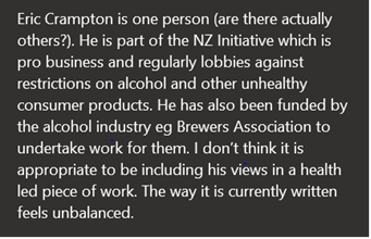 In either case, the effect is a document sent to the Minister, advising on the alcohol health levy, that provides a fairly one-sided view on alcohol social costs.